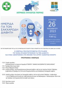 Ο ΙΑΤΡΙΚΟΣ ΣΥΛΛΟΓΟΣ ΠΙΕΡΙΑΣ συνδιοργανώνει με την 3η ΥΠΕ, σε συνεργασία με το Κέντρο Υγείας Λιτοχώρου , την υποστήριξη του Δήμου Δίου Ολύμπου ,την 26.11.2023, ημέρα ΚΥΡΙΑΚΗ και ώρα 11 π.μ., στην αίθουσα εκδηλώσεων του 2ου Δημοτικού Σχολείου Λιτοχώρου ημερίδα για τον Σακχαρώδη Διαβήτη με τη συμμετοχή του κοινού. Η ημερίδα πραγματοποιείται στο πλαίσιο του …